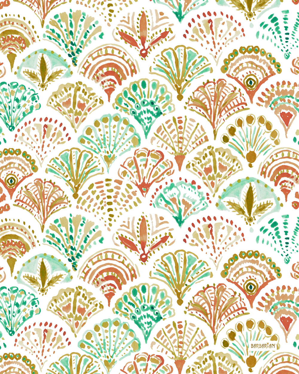 What the shell! This mermaid print is the shelliest one thus far. Sand dollars, clam shells and shells I just made up appear in a decorative fashion. I am a shell out and am completely OK with it.