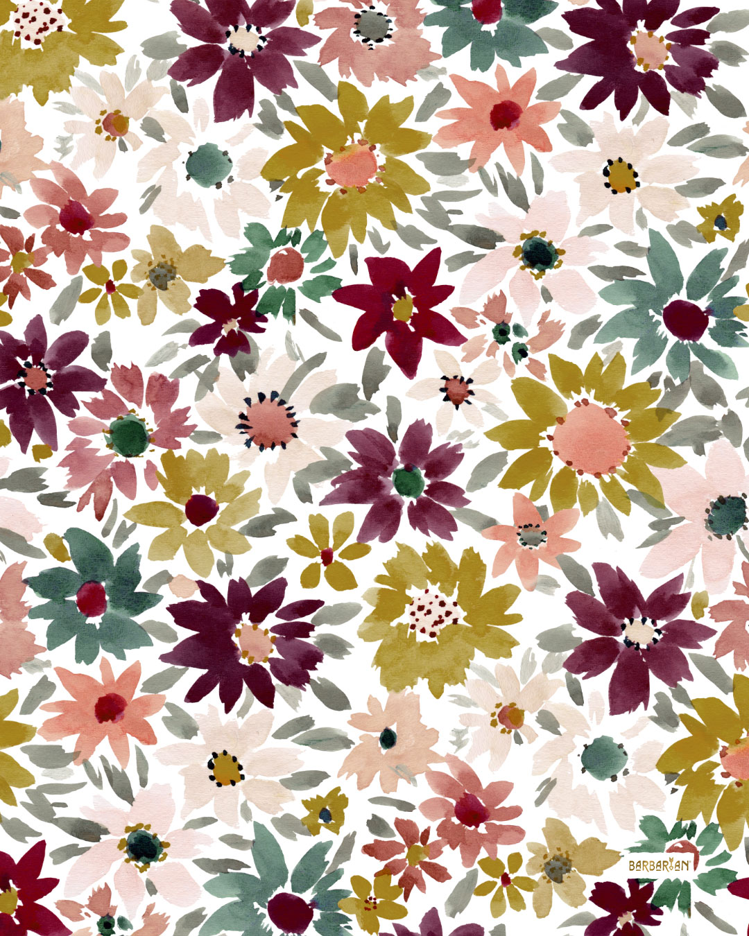 Shop DAISY DAZE SHOP SPOONFLOWER FABRIC + MORE - SMALL SHOP SPOONFLOWER FABRIC + MORE - LARGE Pops of happy painterly daisies in a calming neutral palette of gold, steely greys, off white and maroon. daisies- daisy- FLORAL- flowers- gold- happy- maroon- painterly- Retro- retro palette- watercolor- winter